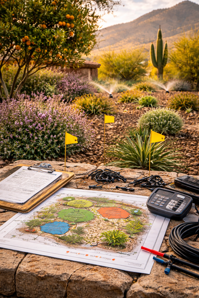 Our installation process begins with a detailed site assessment — mapping plants and their water requirements, testing water pressure, evaluating soil type and caliche depth, and identifying micro-climates created by shade, reflected heat, and wind exposure. We produce a zone map that groups plants by water need, then design the delivery system that best serves each group. You review and approve the design before we begin installation.